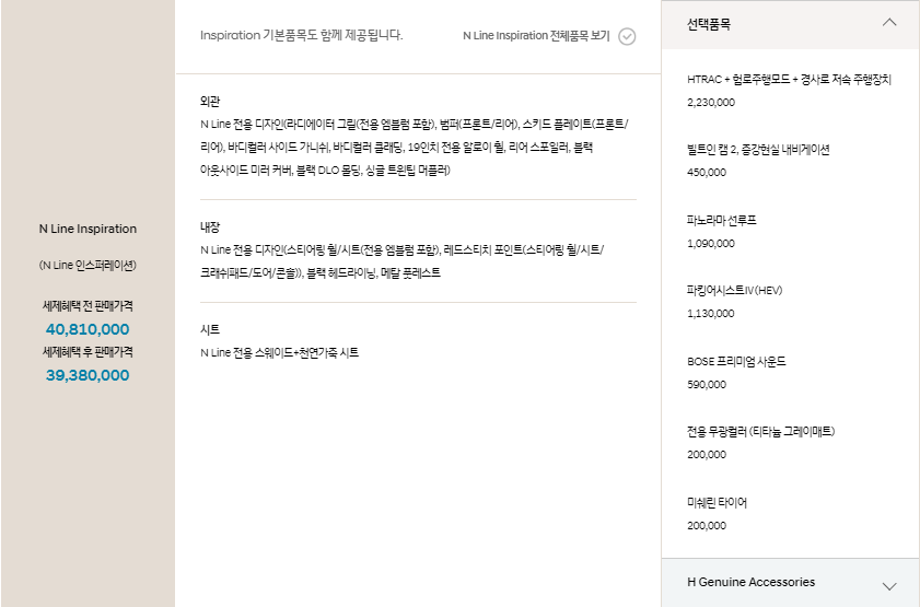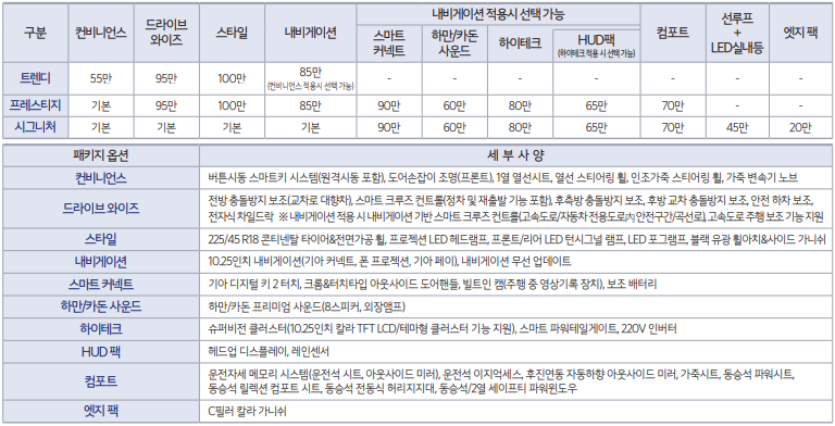 | 스타일 패키지 | 전용 디자인 범퍼, 크롬 몰딩 등 | ₩750,000 |